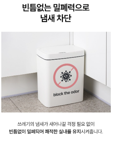 - 빈틈없는 밀폐력: 뚜껑이 닫힐 때 빈틈없이 밀착되어 쓰레기통 내부의 악취가 밖으로 새어 나올 틈을 주지 않습니다. 이는 여름철 날파리가 생기는 것을 방지하는 데도 큰 도움이 됩니다.
